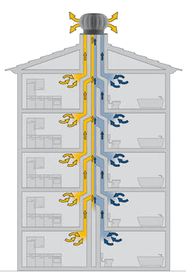 Das GACS – System ist eine innovative technische Lösung für eine alternative Lüftung von Gebäuden, Räumen, Scheunen, Ställe und Dächern, bestehend aus GACS Hybridventilatoren EcoPower, der Verrohrung und Lüfterklappen sowie der eigens entwickelten Steuerungs- und Überwachungseinheit, die die Stellmotoren der Luftklappen und Ventilatoren schaltet, ausgelöst durch Temperatur, Luftfeuchtigkeit, Gaskonzentration in der Luft oder anderen Sollwerten.